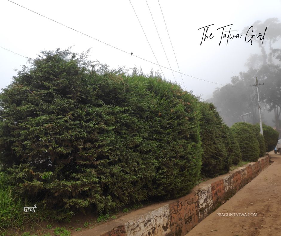 You can see the track where I walk along the beautiful Vidya plants, better known as Oriental Arbor-vitae, Morpankhi, (मोरपंखी), Thuja compacta, Platycladus orientalis.