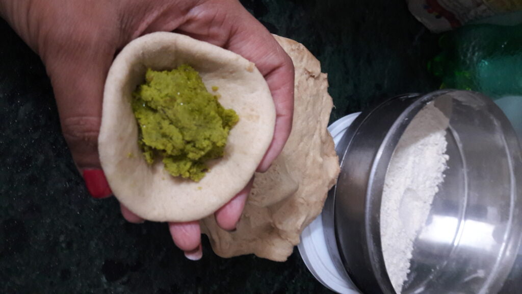 - Fill 2-3 tbsp peas mixture and cover it to form a ball and flatten it slightly. Do not roll it much or do not keep it very thick.