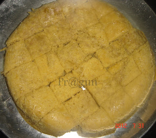 mix all well..so that there are no lumps, then add 1 sachet of non- flavored eno ( fruit salt ) pour it on the batter and mix it vigorously….batter will rise almost double. Now, pour it in about 6 inches greased microwave plate and microwave it on high for 3.5 to 4 mins. Let it cool and then cut it into pieces after few minutes of resting out of the oven…
