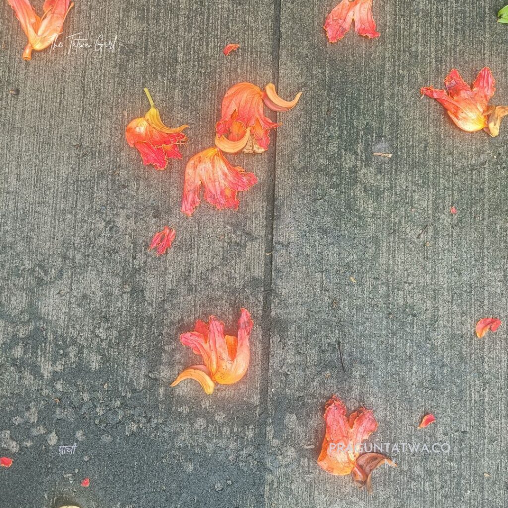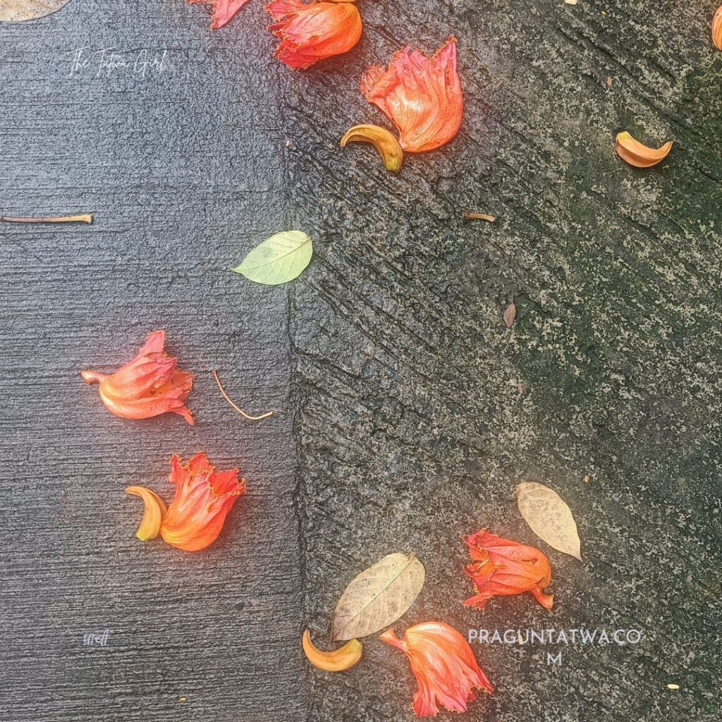 the African Tulip, known as कारंजवृक्ष or आकाश शेवगा (Akash Shevga)in Marathi, रगतूरा in Hindi, and Patadi in Tamil & Telugu, Nirukavi in Kannnada, Rudrapalash in Bengali.